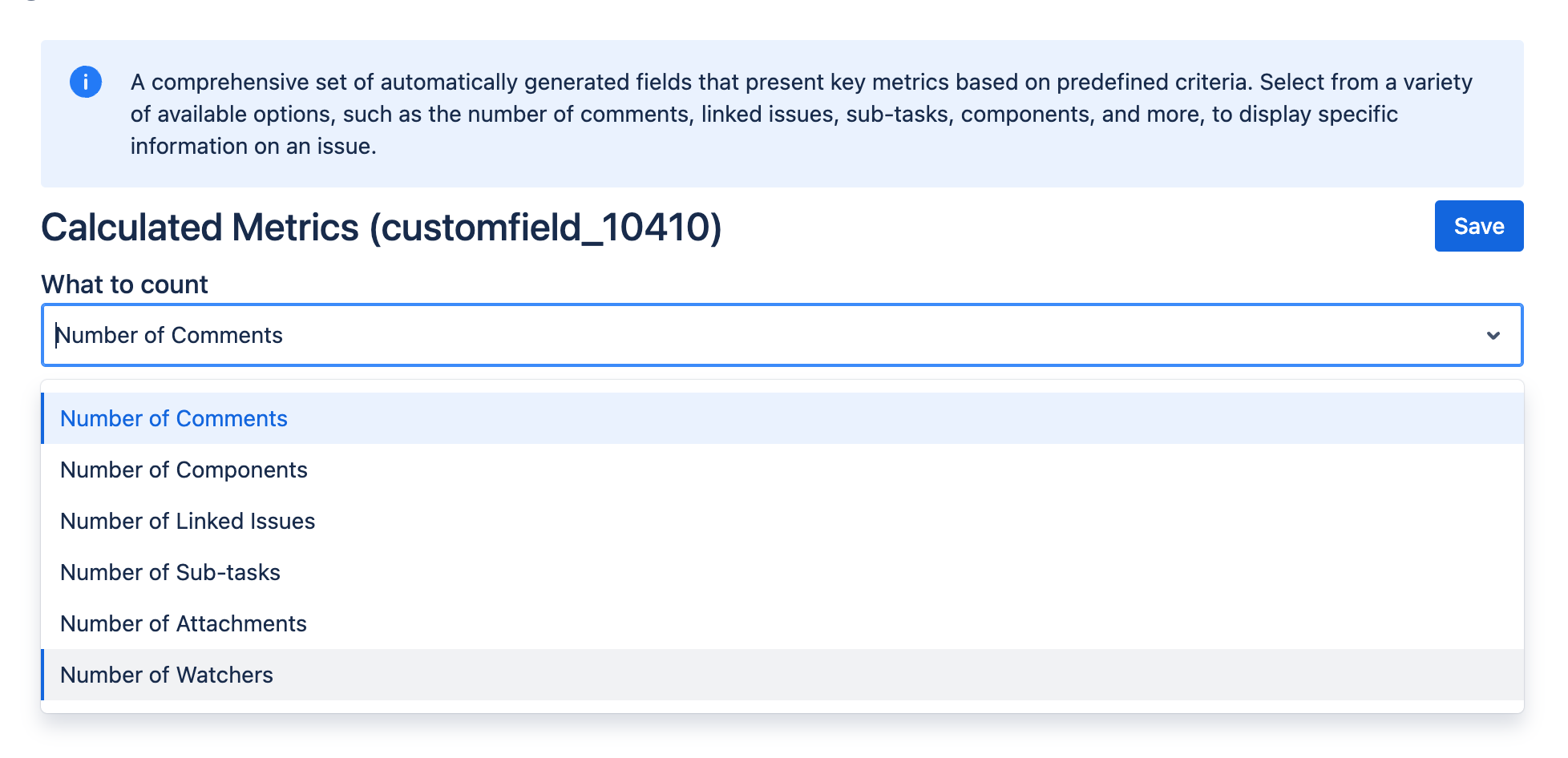 | The Calculated Metrics field type provides a dynamic way to display key metrics on issues by automatically calculating and presenting data based on predefined parameters. |