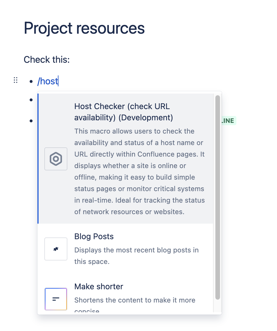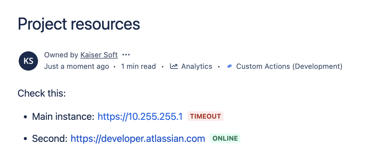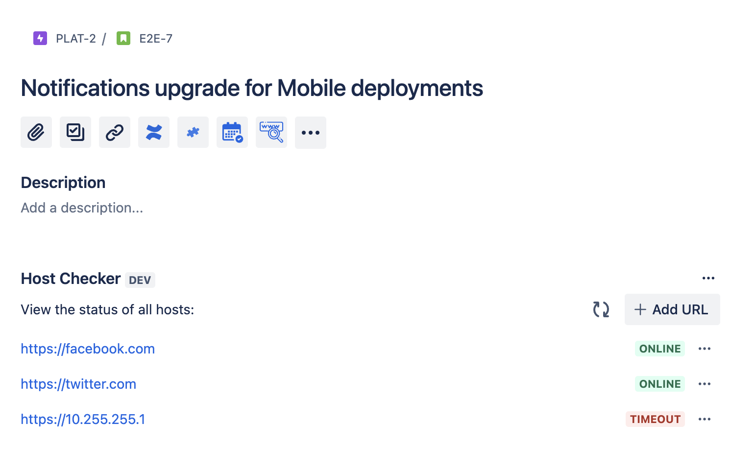 Host Checker for Jira & Confluence allows you to monitor the availability of URLs and host names within both Jira issues and Confluence pages. It provides real-time status updates, showing whether a site is online or offline, making it an essential tool for tracking key systems and services, performing inventory checks, and building simple status pages.