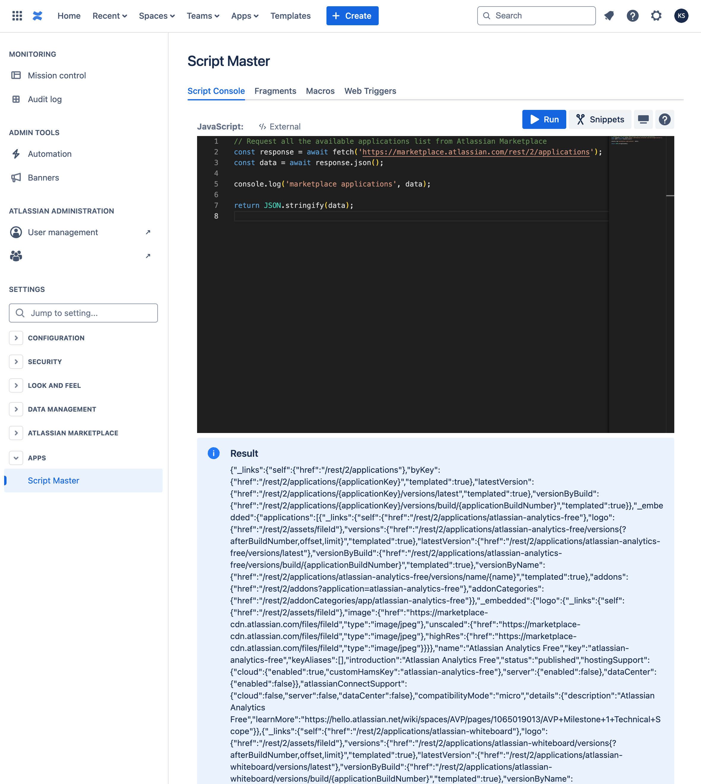 The Script Console runs all scripts in the context of the current user, adhering to their permissions. This means it cannot read or modify any content that the current user does not have access to. You can use JavaScript to perform external fetch calls and employ special bridge methods for seamless interaction between your script and Jira/Confluence.