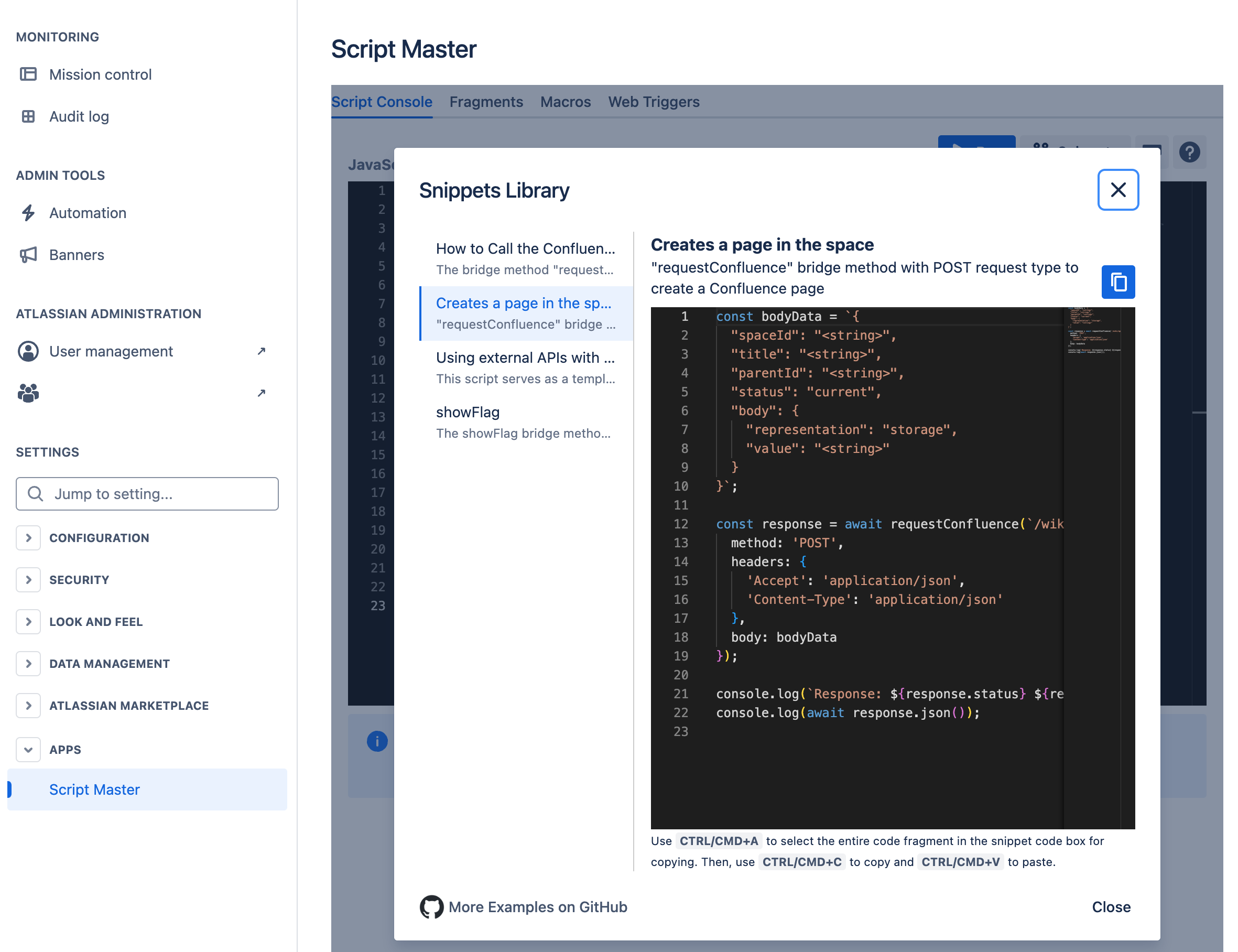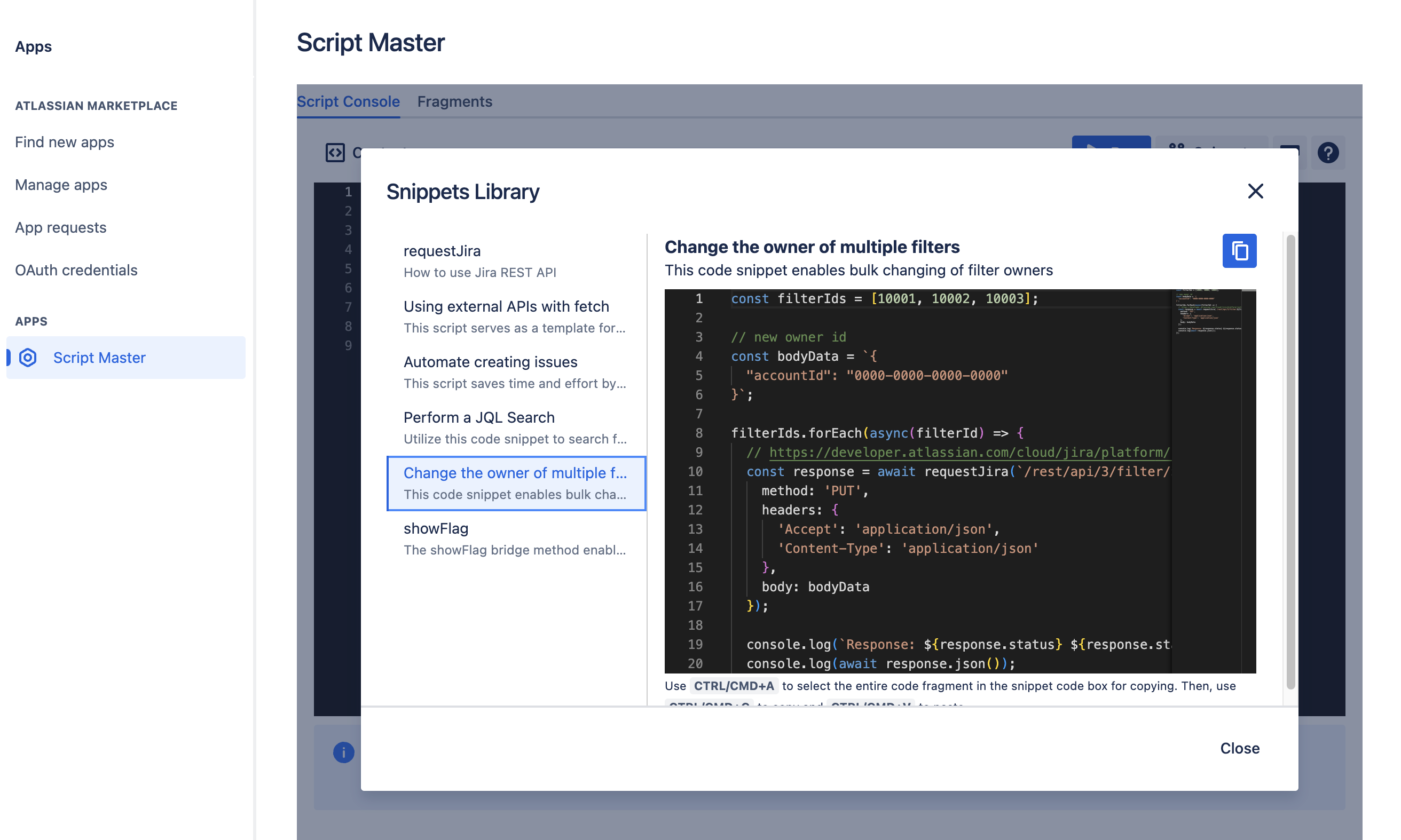 The in-app Snippets Library consists of various script examples that will help you get started with building amazing scripts. It explains the basics of getting data from the Application REST API and sending POST/PUT requests, making it easier to automate and customize your cloud instance.