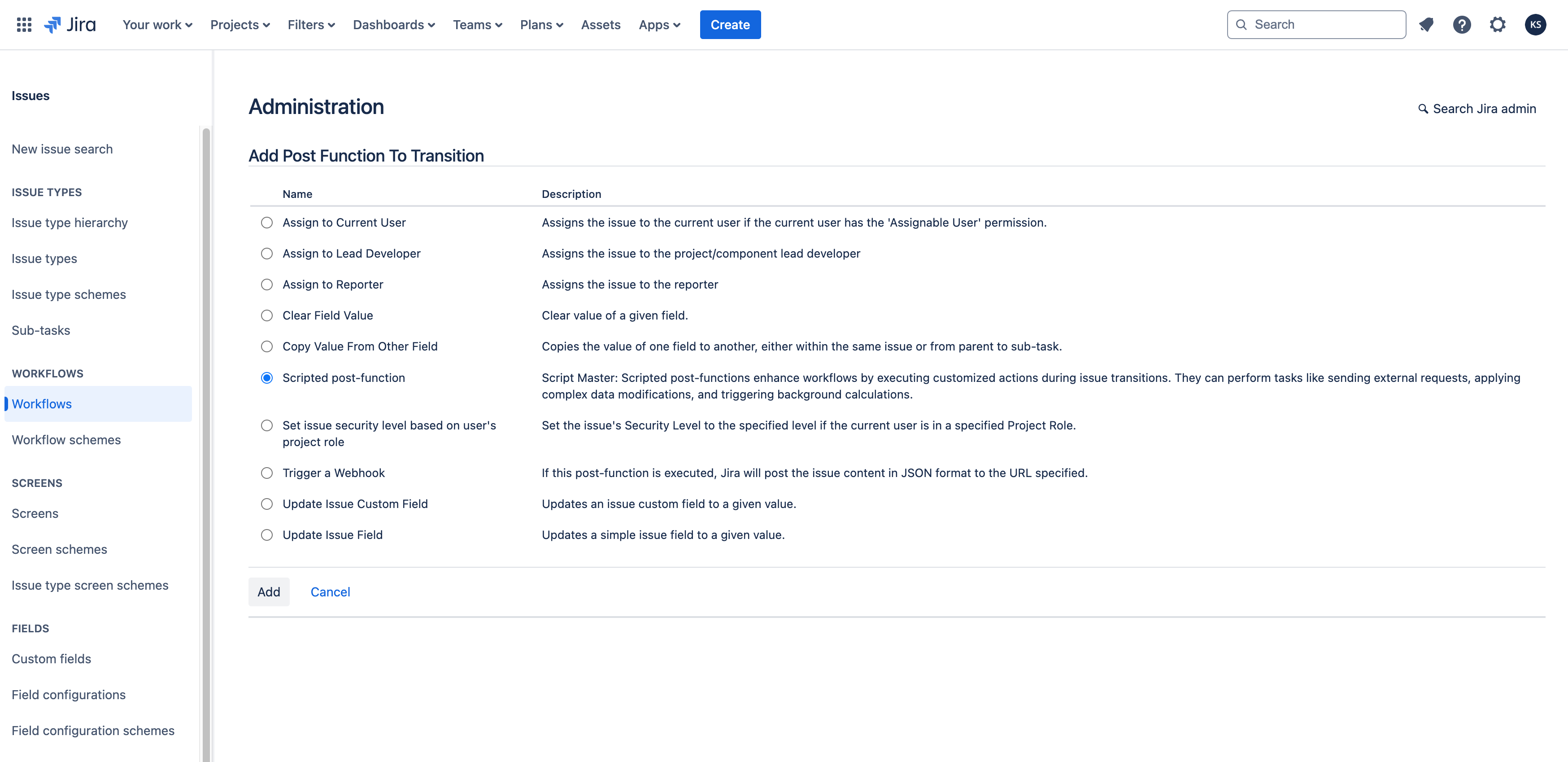 Scripted post-functions allow you to enhance your workflows by enabling the execution of highly customized and unique actions during issue transitions. These post-functions can be configured to perform a variety of tasks, such as sending external requests, applying complex data modifications, triggering background calculations, and more.