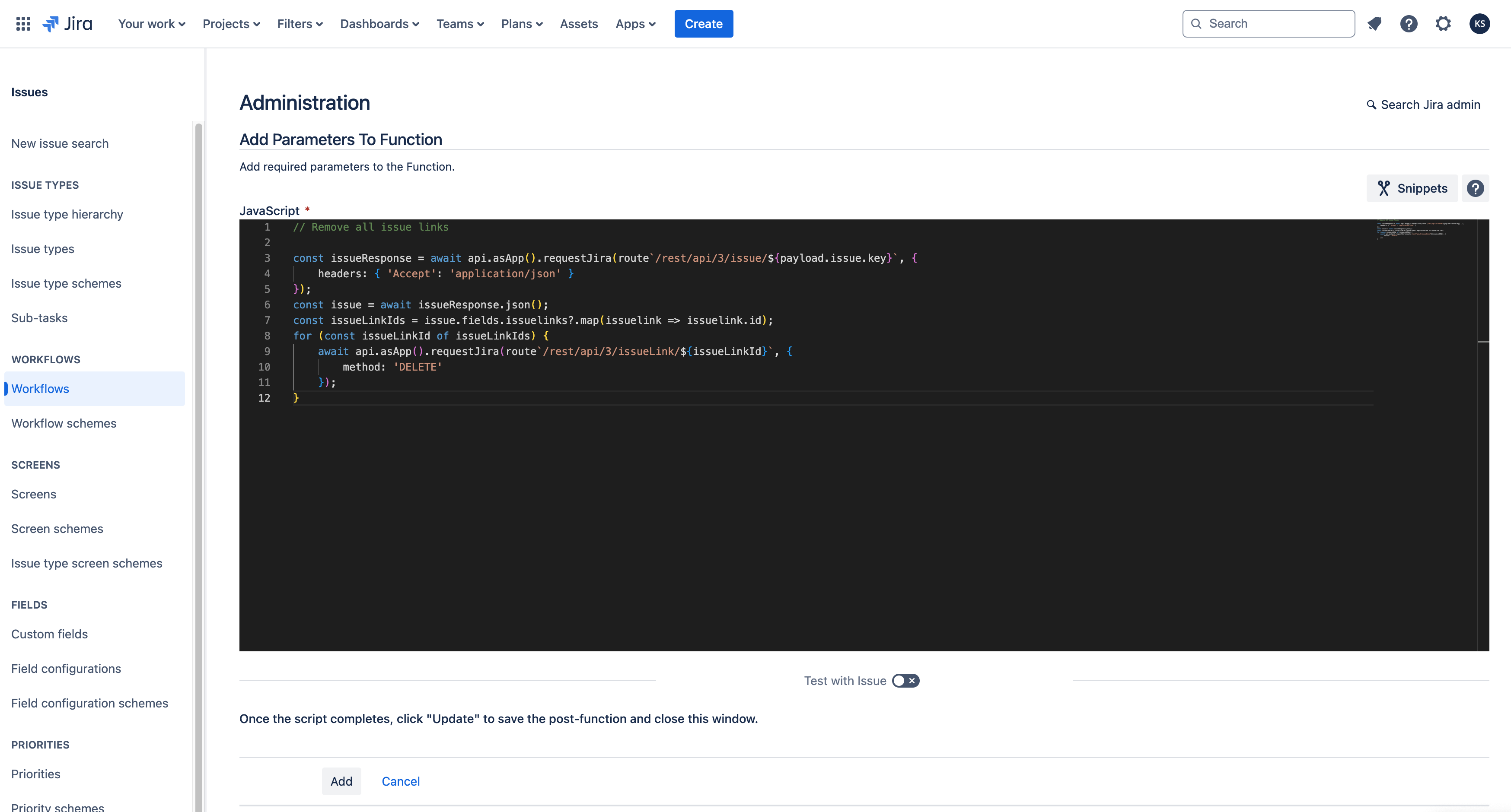 Please note that the script size for a workflow post-function must not exceed 100 kB; otherwise, it will not be saved.